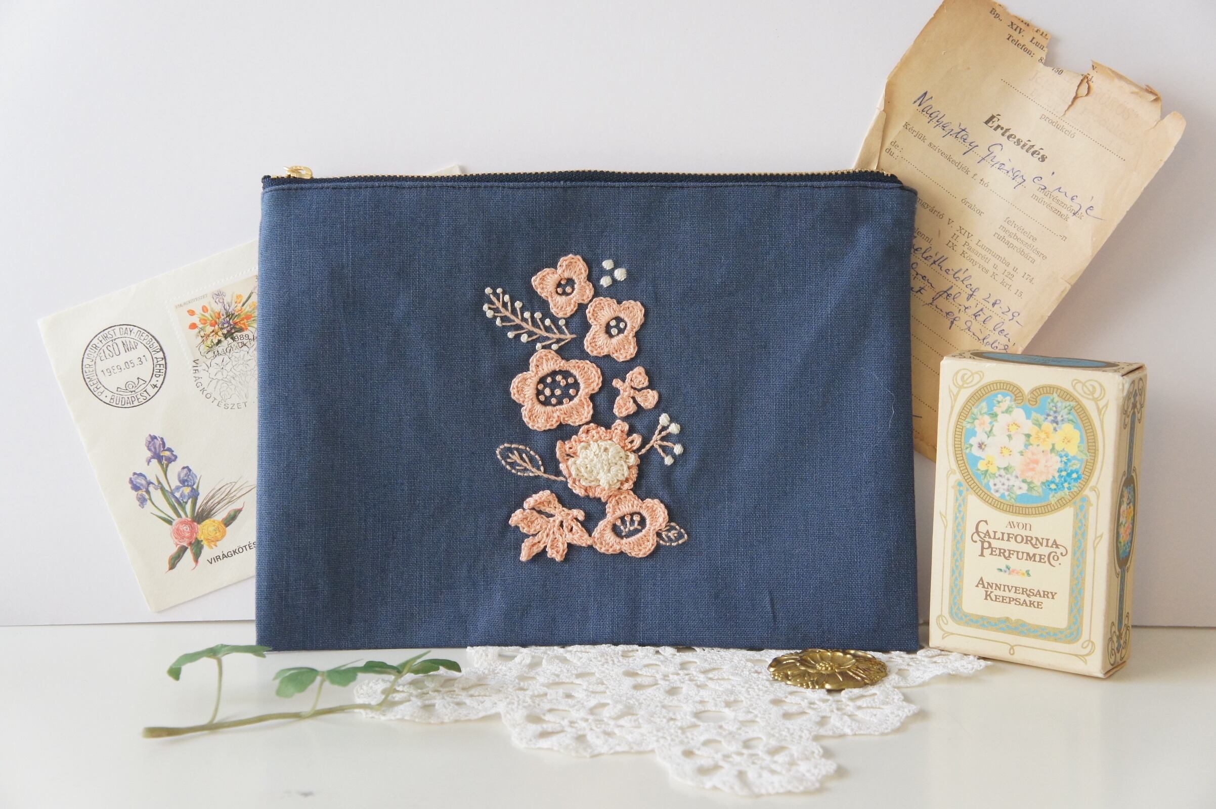 *タブレット(ipad mini)が入る Lサイズ ■size 縦17cm×横23cm 8番刺繍糸でモチーフを編み、一つ一つ丁寧にステッチしました。 カードが入るサイズの内ポケット付きです。 マチがないぺたんこポーチなので バッグの中で場所をとらず スッキリ・スリムに使えます! 〝嵩張るからポーチは使わない!〟 という方にもオススメ♪です。