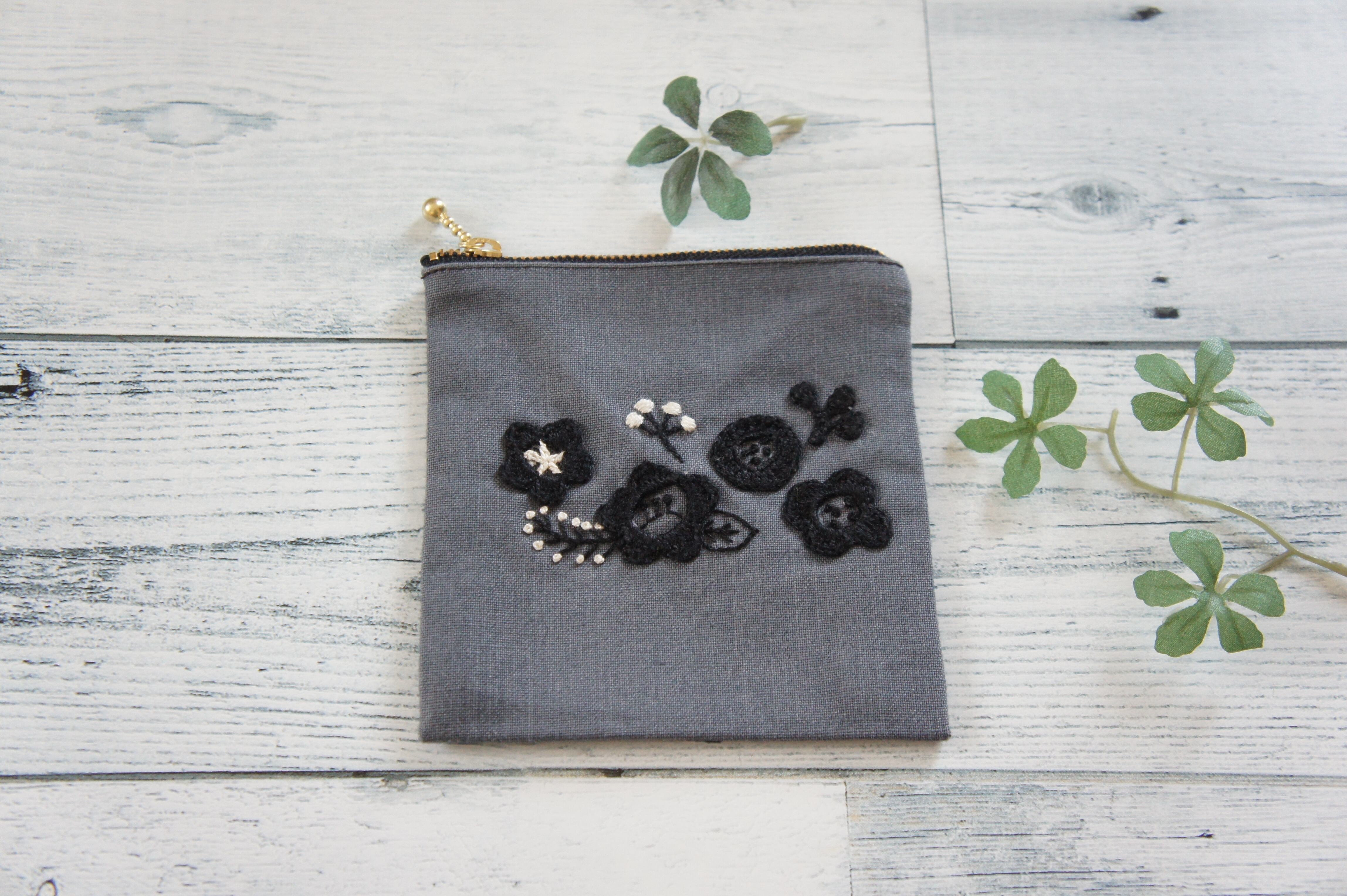刺繍&クロッシェのぺたんこポーチ(グレー)M