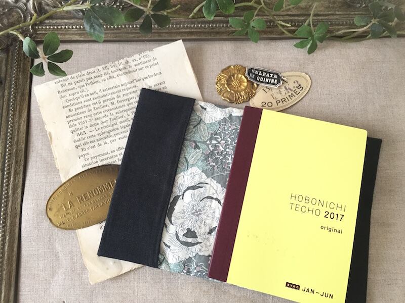 ■size 縦11㎝×横15㎝ シンプルなステッチでアンティーク図案を 刺してみました。 背表紙部分にかぎ針で編んだ ポケットをつけているので ペンを収納することができます。 内布には同色系のリバティ生地を使用。 接着芯を貼ってあるので しっかりとしたカバーになっています。 ほぼ日手帳Avecの半年分にぴったりな大きさです。