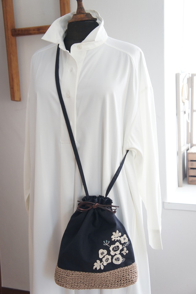 ■size:縦12cm×横21cm×マチ5cm たっぷり入って出し入れしやすく、 軽量で使い勝手の良い巾着Bagです。 底部分にラフィス(和紙の糸)で編んだ カバーが付いているため、型崩れの心配もなく 旅行の際のサブバッグとしてもおススメです。