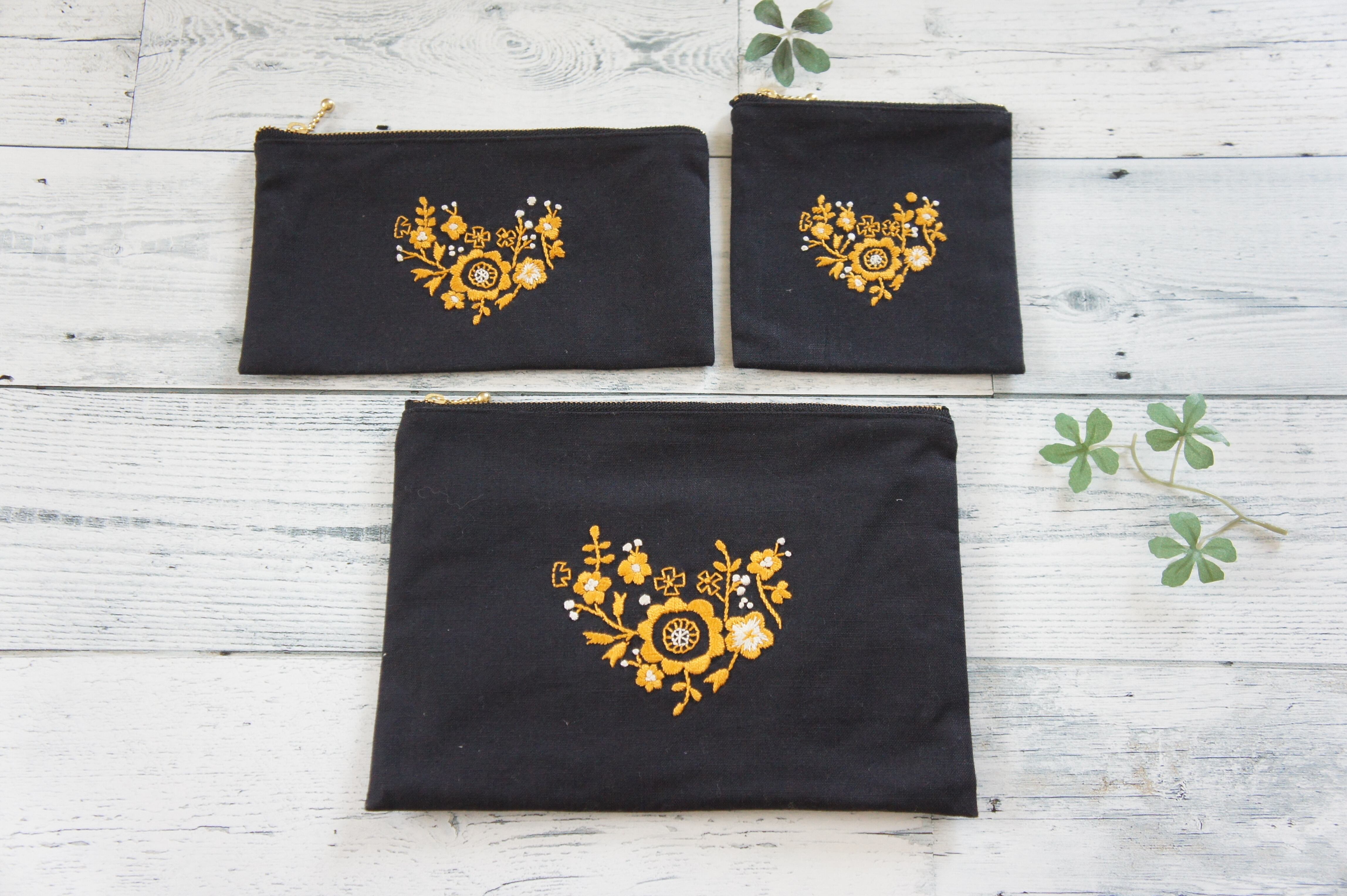 刺繍のぺたんこポーチ(マスタードイエロー・L)