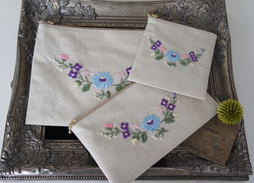 刺繍のぺたんこポーチ(ベージュ・クレッセント)M