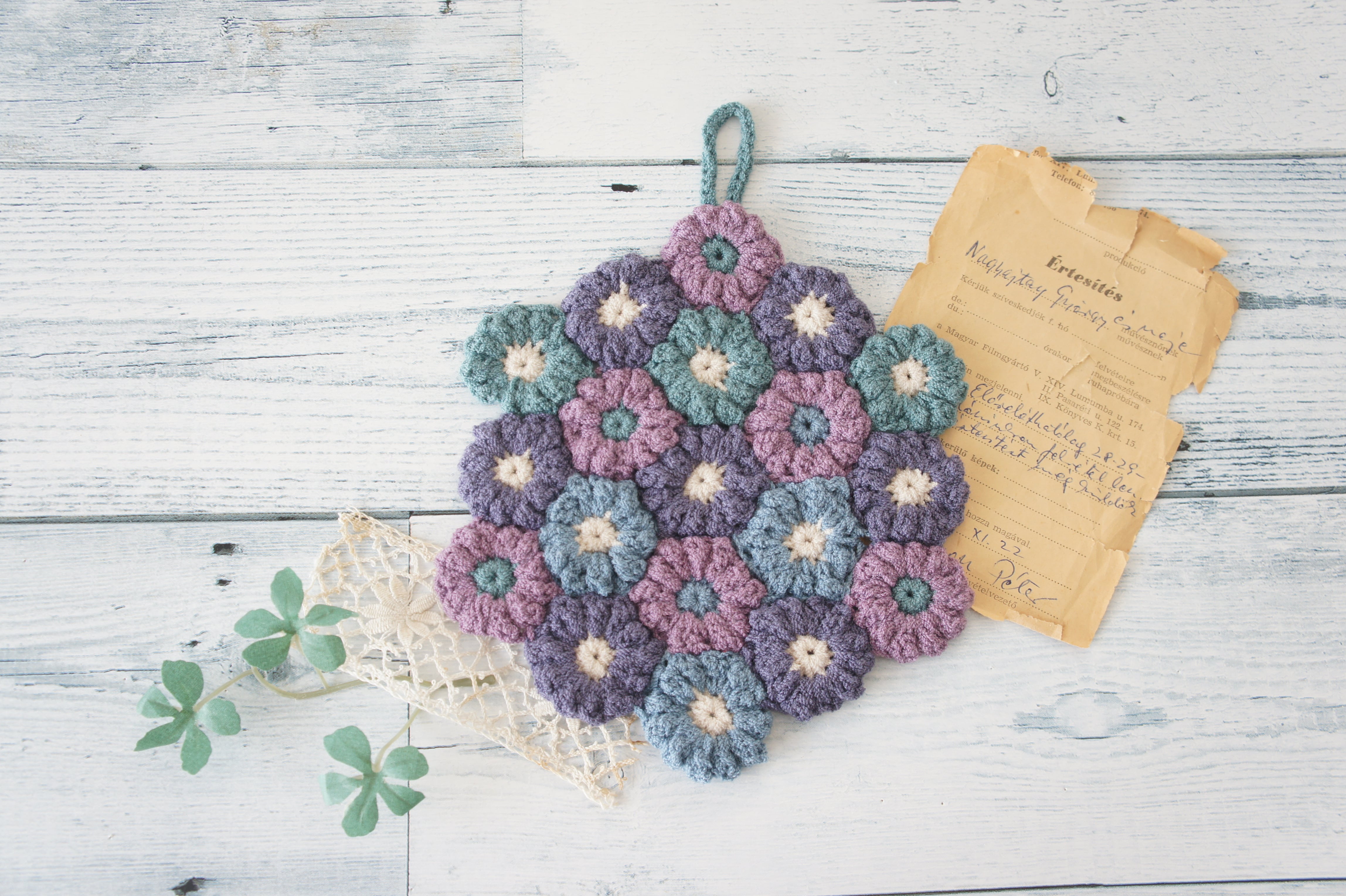 柔らかな色合いが愛らしい丸モチーフのポットマット。