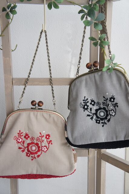 刺繍&クロシェのがま口Bag(グレー・黒)