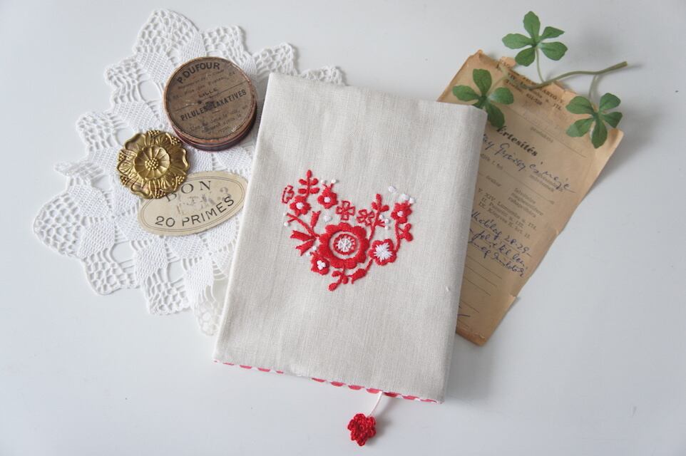 ■size 縦15㎝×横11.5㎝(文庫サイズ・折りたたみ時) 8番刺繍糸でアンティーク図案を 刺してみました。 スピン(栞紐)の先には手編みの お花が付いています。 接着芯を貼ってあるので しっかりとしたカバーになっています。